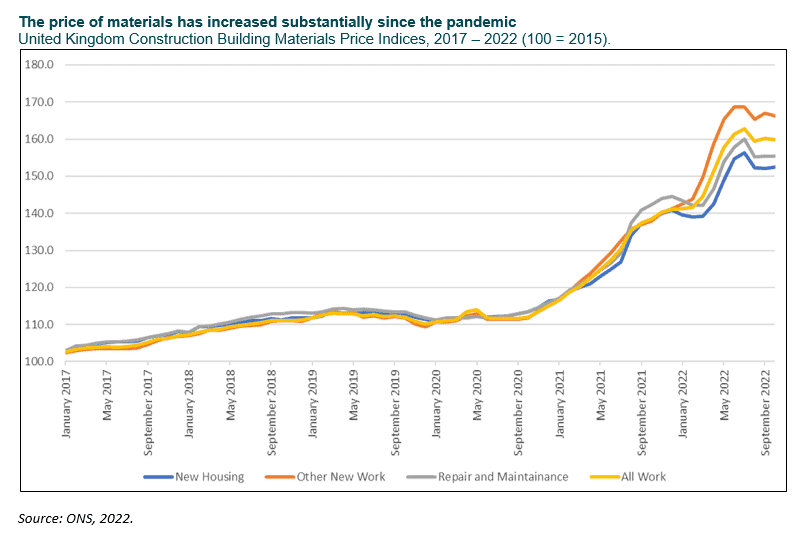 In the 24 months between October 2020 and October 2022, the UK Construction Material Price Index for New Homes increased in all but four of those months. The index currently stands at 152.4 in the latest figure for October 2022, an increase of 14 from October 2021. While growth in the index appears to have stalled since the highs seen in July, it remains to be seen whether this latest levelling off of material costs is temporary or permanent.
