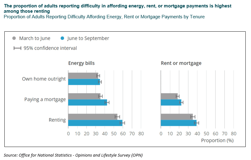 The ONS Opinions and Lifestyle Survey provides an insight into how people in the UK feel they are coping with their living costs. As would be expected, those on lower incomes of less than £20,000 per year are particularly struggling during the cost of living crisis, with around half of those surveyed stating that they found it difficult to afford their energy bills. The latest results also show that approximately four in ten renters surveyed between June and September found it difficult to afford their rent payments. For those with a mortgage, this figure was lower, with 23% stating they found it difficult to afford their mortgage payments. When compared with the previous survey of March to June 2022, the results show that across all tenures adults are finding it increasingly more difficult to afford their energy, rent and mortgage payments, further strengthening the need for more affordable housing provision.