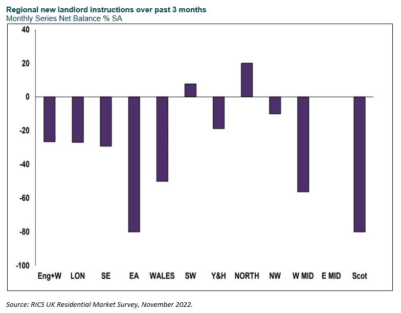 During the cost of living crisis, interest rates have increased, with the Bank of England base rate now at 3.5%, up from 0.1% in December 2021. This increase in interest rates, coupled with the surprise rent freeze introduced by the Scottish Government in September 2022, may continue to force small-scale private landlords out of the sector. The RICS national survey results show a significant reported decrease in new landlord instructions across the UK, particularly in Scotland. As small-scale private landlords exit the sector, the undersupply of homes may provide an opportunity for institutional investors to meet this housing demand.