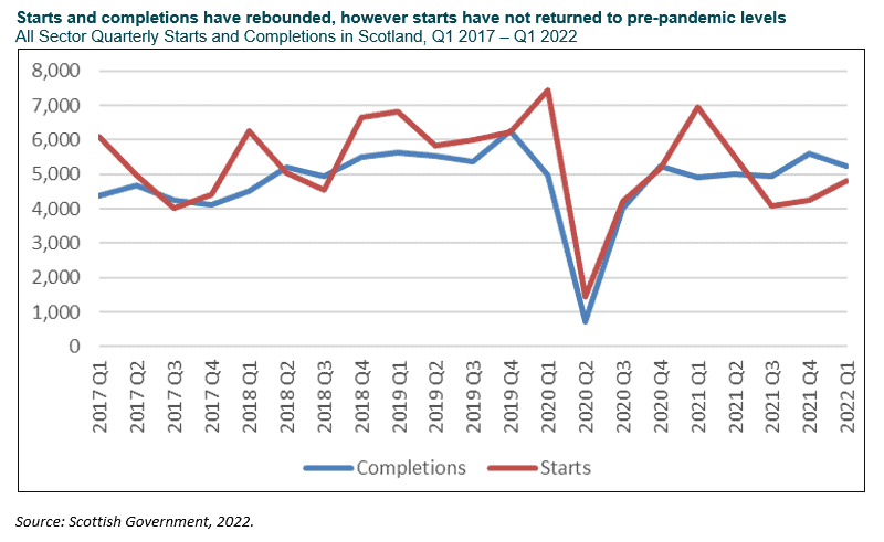 The latest data released on starts and completions provides figures up to and including Q1 2022. Since then, the housing market has changed dramatically, with increased interest rates, higher construction costs, and the introduction of a temporary rent freeze until 31st March 2023. When the next set of data is released, it will be interesting to see what impact these factors have had on starts across Scotland since Q1 2022.