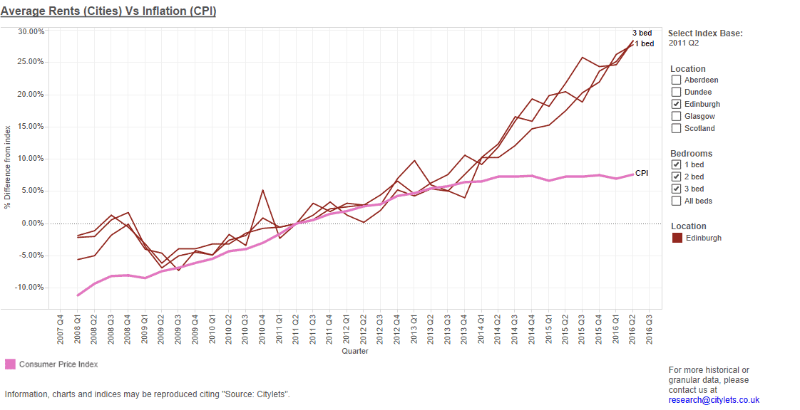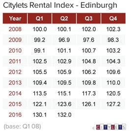 The Citylets Rental Index for Edinburgh currently stands at an all time high of 132, up from its Q1 2008 base at an average of around 4% per year. It is likely that the Edinburgh index will keep climbing.