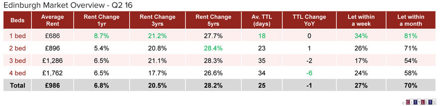 The Citylets Report to Q2 2016 records 1 bed properties in Edinburgh as the largest risers, up 8.7% on the year to average £686 per month and taking just 18 days to let. 34% of 1 bed properties in Edinburgh let within a week and 81% within a month. 2 bed properties also recorded positive annual growth at 5.4% to stand at £896 with an average Time to Let of 23 days.