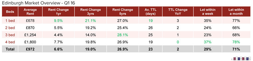 Average asking prices for property and flats to rent in Edinburgh maintain their march upwards towards the £1000 mark, with rents up 6.6% on the year to stand at £972 at Q1 2016.