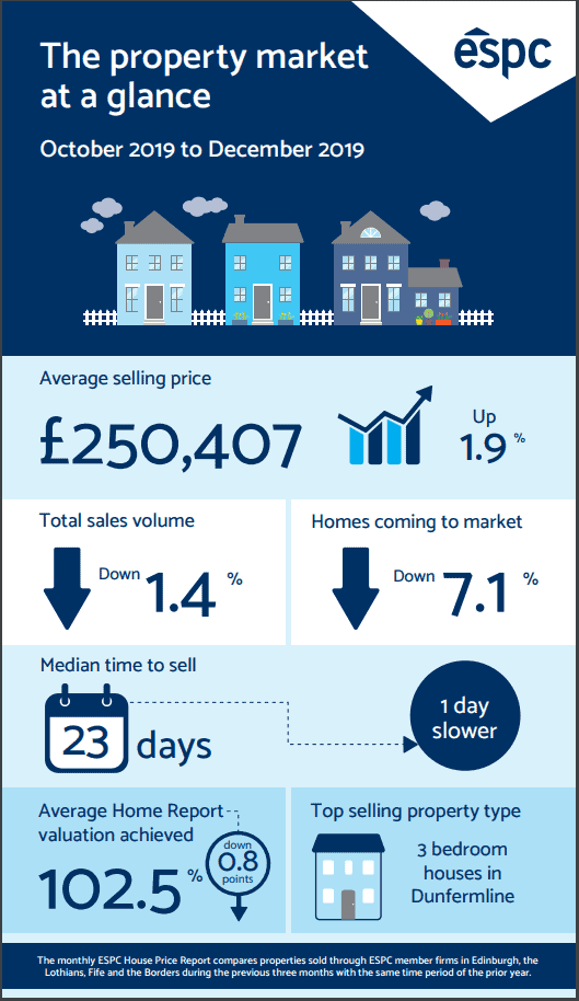 ESPC’s Business Analyst, Jamie Fraser-Davidson, stated: “The end of 2019 saw a slight increase in average selling price in Edinburgh, the Lothians, Fife and the Borders, along with a slight decrease in sales volume. However, the most notable figure was the drop in the number of homes coming to market, particularly in Edinburgh.