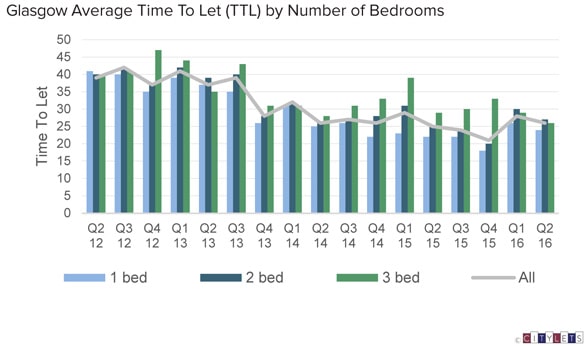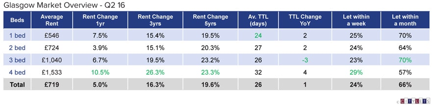 Larger 3 & 4 bed properties both rose sharply by 6.7% and 10.5% over the year to stand at £1040 and £1533 per month respectively reflecting the increased demand for family homes. Indeed 4 bed homes were the biggest risers as at Q2 2016 from the 1,3 and 5 year perspectives. 66% of all property in the Glasgow rental market now lets within a month.