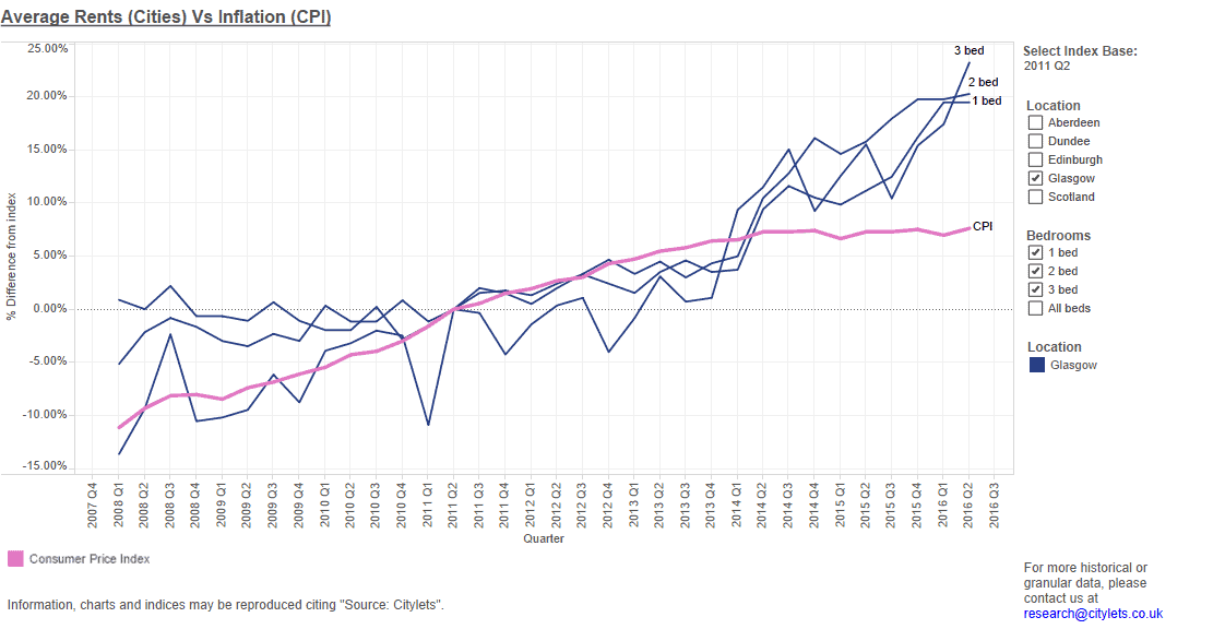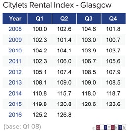 The Citylets Rental Index for Glasgow currently stands at an all time high of 126.8, up from its Q1 2008 base at an average of around 3.5% per year.