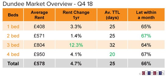 Dundee had a strong end to 2018 with annual growth of 4.7% and continuing a year that saw positive annual growth throughout. Properties are also renting faster at just 25 days and it remains to be seen whether this represents a step change in a hitherto predictable and stable market. Two thirds of Dundee properties now let within a month with an average rent of £578 per month.