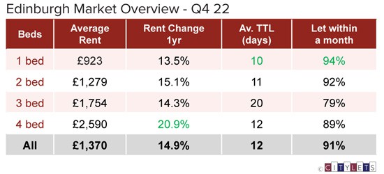 The Edinburgh lettings market recorded a double digit annual growth of 14.9%, with the average property renting at £1,370. Time to lets remained almost unchanged compared to the same time in 2021, now at 12 days.