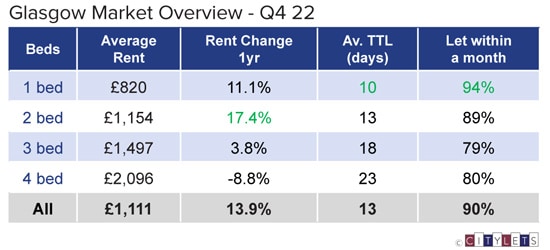 The competition for property to let in Glasgow over Q4 2022 was also fierce, with properties taking 13 days to let on average. Rents in Glasgow continued to push upwards to an average of £1,111, up 13.9% year on year.