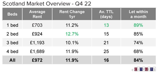 Q4 2022 saw low stocks, relative to demand, sending initial rents in Scotland up 11.9% year on year to average £972 per month, the steepest rise on record in 16 years of Citylets’ reporting. The average property took 16 days to let in the last quarter of 2022, highlighting the fact that rental property remains in high demand across the country.