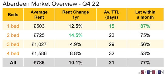 Aberdeen recorded annual growth at 10.1%, with the average property for rent in the Granite city commanding £786 per month and time to lets significantly reduced to 21 days.