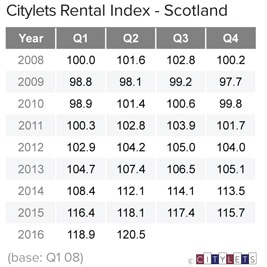 The Citylets Rental Index for Scotland currently stands at an all time high of 120.5 up from its Q1 2008 base at an average of around 2.5% per year. It is likely that the index will keep climbing driven by strong growth in Scotland’s central belt.