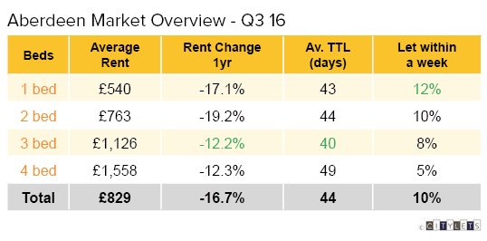 Q3 2016 has seen both an easing annualized rate of decline for average rents and a reduction in TTLs, both indications that the Aberdeen rental market is starting to level off. Average rents in the city recorded a 16.7% drop YOY, less that the 20% recorded at the previous 2 quarters, to stand at £829 per month and representing a 25% fall from the £1110 figure recorded at Q4 2014 market peak. Average TTLs are now 44 days and whilst 10 days longer than a year ago, this represents a fall from 47 days at Q2 2016 and 53 days as at Q1 2016.