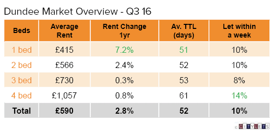 Elsewhere to the south, Dundee posted a 2.8% YOY gain as at Q3 2016 with average rents now at £590 per month and taking 52 days on average to let. West Lothian and South Lanarkshire both recorded strong YOY growth at 5% and 5.8% respectively and with falling average TTLs of 32 days and 36 days.