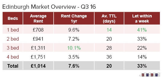 The latest Citylets Quarterly Report to Q3 2016 shows average rents in Edinburgh have broken the £1000 per month mark for the first time and growth in Glasgow has accelerated from last quarter at 7.2%. And there is little sign of things changing any time soon.