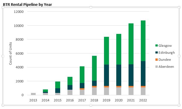 The much heralded, and still anticipated, potential solution for this shortfall is the emerging Build to Rent (BTR) sector in Scotland. While there are only a handful of operating schemes across Scotland, the pipeline of units progressing through the planning system has been growing year-on-year and now currently stands at over 11,500 units.