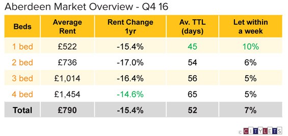 The easing in the annualized rate of decline observed last quarter has held steady in Q4 with average rents in the city down 15.4% to stand at £790 per month. Average TTLs are now 52 days, a moderate 6 days up on last year and further indication that the Aberdeen rental market is finding its new level.