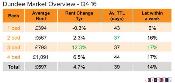 Dundee average rents posted a 4.7% annual rise to stand just shy of £600 at £597 per month in a quickening market where average TTLs fell by 4 days to 39 and with 49% of properties now letting within a month.