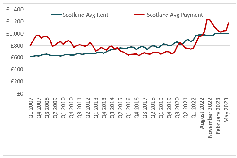 When comparing the average cost of a mortgage in Scotland (based on the average house price and using the average loan to value, loan to income and 2-year 85% fixed rate mortgage) with the average rental payment, these costs have varied over time in relation to each other, as shown below.