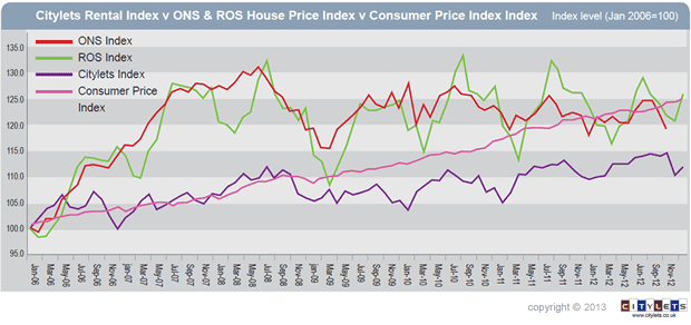 Citylets have been analysing the trends in the Scottish rental market for more than 7 years and we have witnessed a strong growth in both demand and supply of properties. It seems these two market forces are well balanced with average rents easing upwards at a rate that is below both house price inflation and general inflation. In October 2012 the Citylets Scottish rental index (Jan 2006 = 100) had a value of 114.8 which means average rents rose by almost 15% since 2006 while Scottish house prices rose by 22%. However background inflation which is measured by the Consumer Price Index (CPI) has risen by 25% in the same period which means over those seven years average rents have not kept pace with inflation.