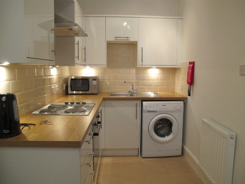 The kitchen is fitted with white cupboards and a wood-effect laminate worktop, and comes fully equipped with an electric hob, extractor fan, sink area, washing machine and fridge freezer.