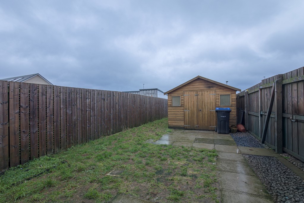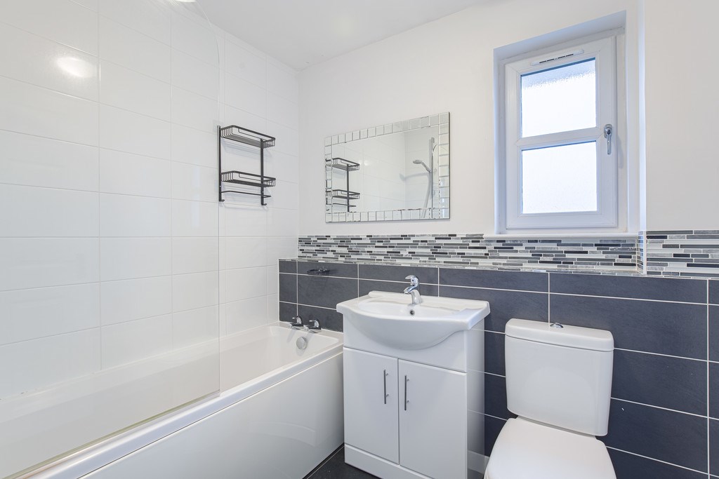 BATHROOM The main bathroom for this property is located on the upstairs, just ahead of the landing. This bathroom feels clean, modern, and calmly styled with a singular garden facing blurred window providing great lighting. A courageous blend of black and white coloured tiling here creates a comfortable bathroom space complete with a large bath-shower area.