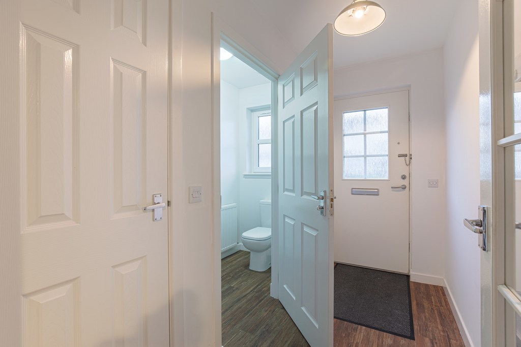 DOWNSTAIRS BATHROOM This bathroom is a bright and easily accessible room on the ground floor. The compact sink and contemporary toilet are thoughtfully positioned, making excellent use of the space. A wall-mounted mirrored cabinet adds both storage and practicality, keeping the room clutter-free and streamlined. Overall, this is a smart and inviting guest bathroom that is modern and finished to a high standard.