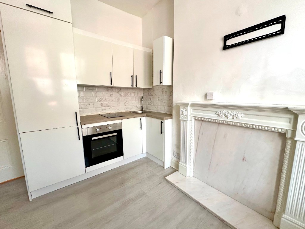 The bright open plan lounge and kitchen offers cosy living space with a storage cupboard, range of floor and wall mounted fitted units, two ring ceramic hob, electric oven and fridge/freezer.