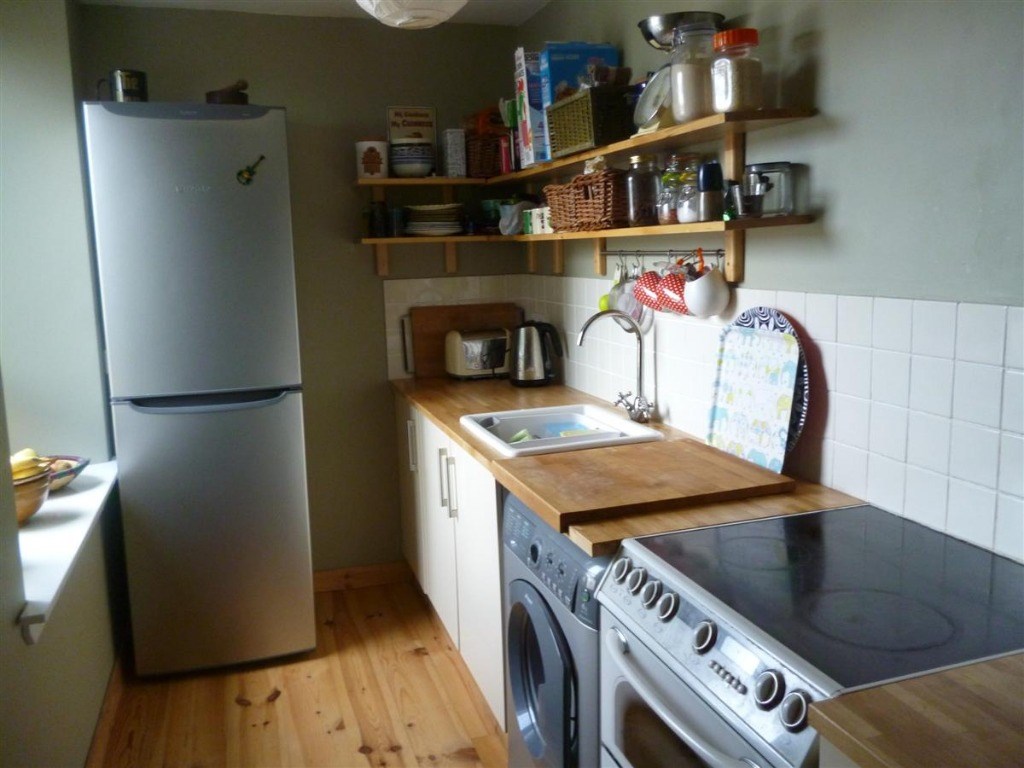 Kitchen - galley style with fitted units and worktop. Featuring electric free standing oven, fridge/freezer and washing machine.