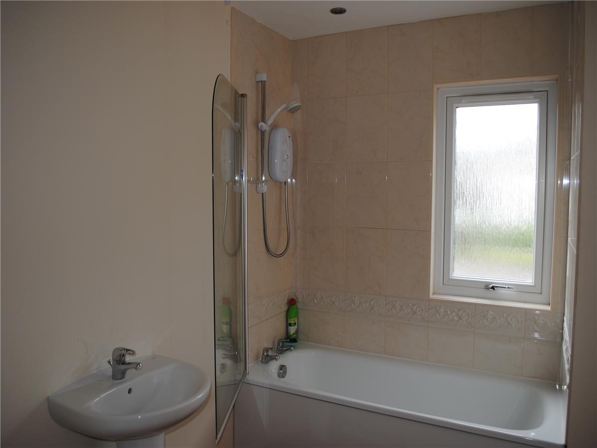 Bathroom - 10'7 x 6'3 - with WC , wash hand basin and bath with shower and glass screen , extractor fan .