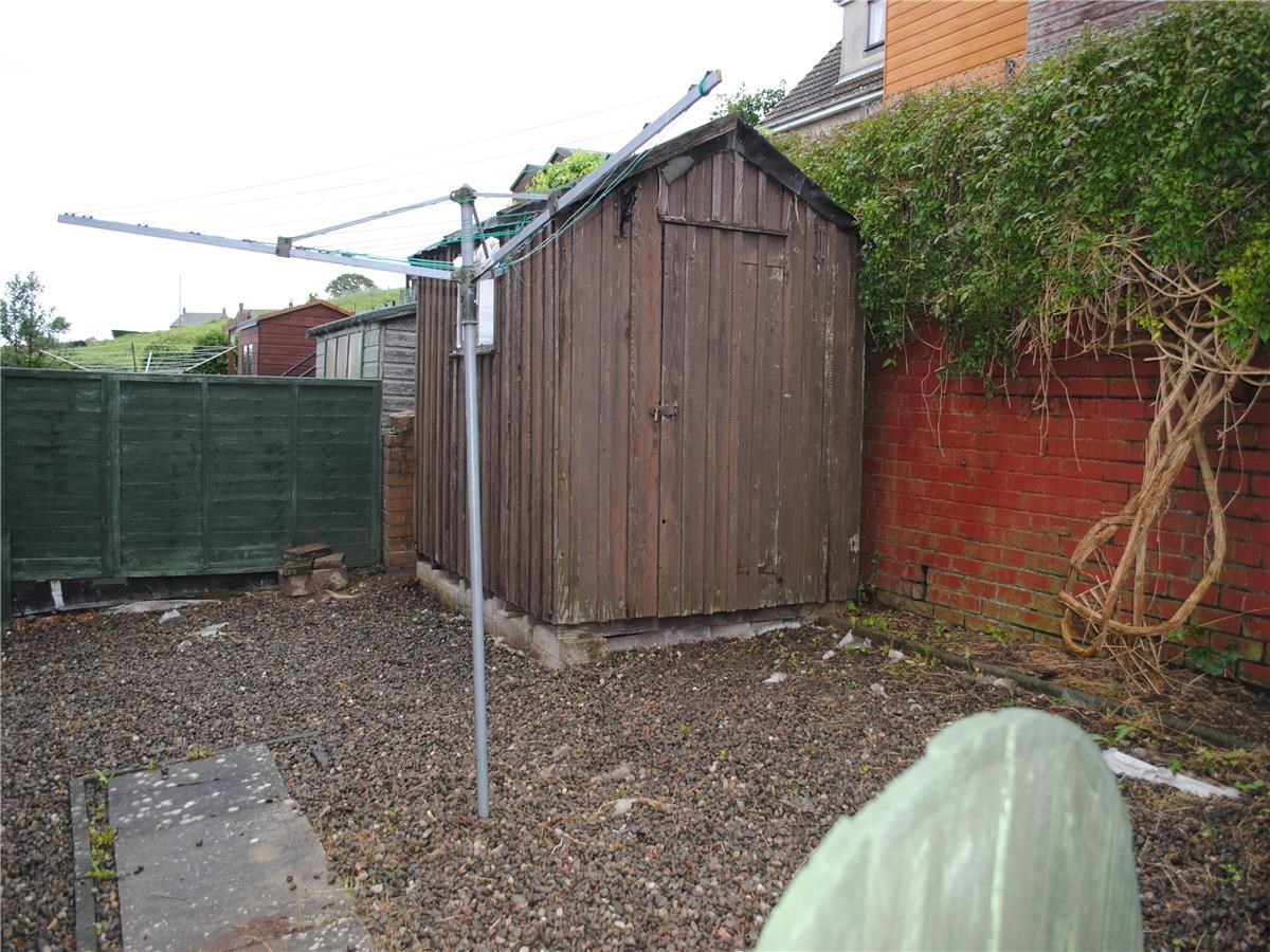 Enclosed gravel garden with shed to the rear.