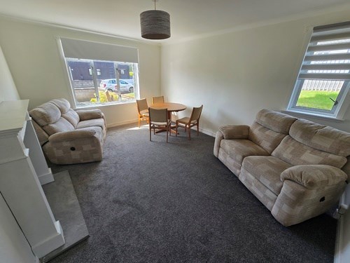 A large bright and airy lounge with two, two seater sofas and a round dining table. Neutral decoration and plenty of room for further furniture of your choice.