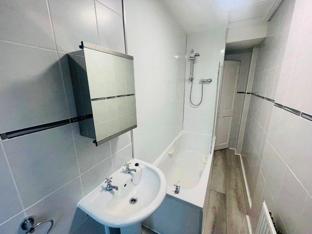 The accommodation comprises a bright living room to the front, two well-proportioned bedrooms with plenty of storage, and a fitted kitchen complete with fridge-freezer, electric oven, hob, and washing machine. The contemporary bathroom features a bath with electric shower, finished to a modern standard.