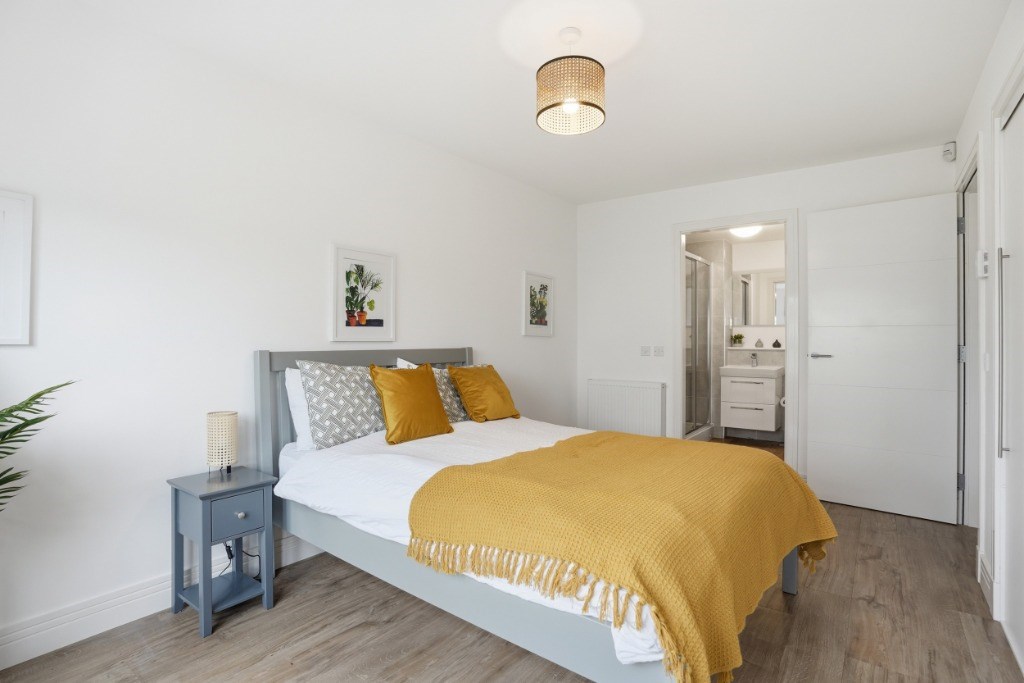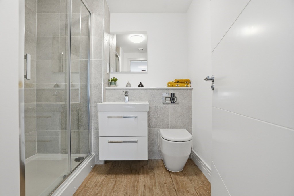 The main bedroom has a double bed, wooden flooring throughout, bedside table and a spacious built in wardrobe. The bedroom has access to en-suite, the en-suite has a shower enclosure, sink with storage underneath, heated towel rail and motion censored LED mirror. The en-suite is tiled throughout making it easy to clean and wipe down.