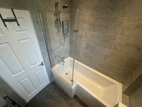 -Modern bathroom with electric shower over bath, easily maintained tiled flooring and walls.