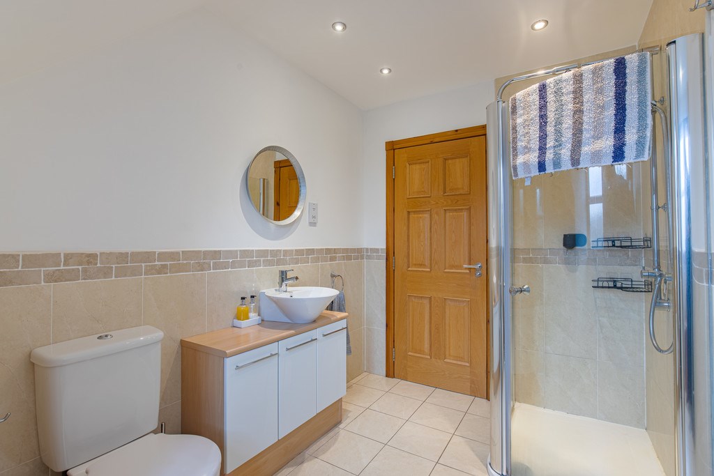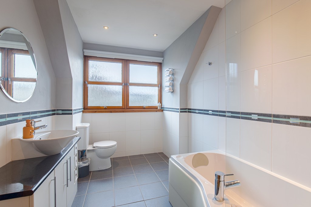 BATHROOM This bathroom is located up the stairs of the property and directly ahead as you reach the landing. This bathroom provides a practical and spacious interior with a subtle yet relaxing tiled floor scheme. The room is complete with a large bath shower, and a well-sized bathroom sink unit beneath a large circular mirror.