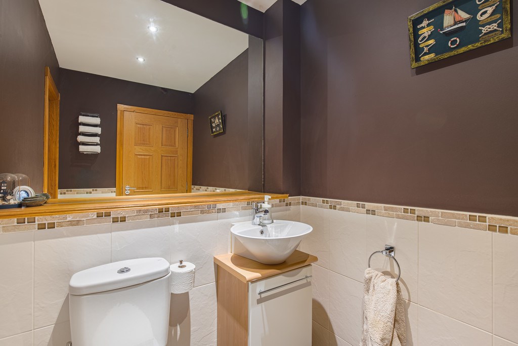 WC The ground floor bathroom for this property is located directly down the hall and on the right as you enter. This room provides an ideal and accessible bathroom location for the house and allows you to miss out on a trip up the stairs. The bathroom itself sports a modern interior with a large glass mirror, dark purple walls and a generous amount of space.