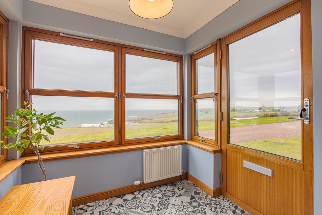 SUN ROOM This exceptional sunroom/conservatory is located through the kitchen area of the house and greets you with a stunning interior with light pouring in from all angles. The vintage wooden desk and classic clock bring a touch of timeless charm, giving the room personality and a sense of history. Meanwhile, the modern touches such as the sleek TV and clean lines, balance everything nicely.