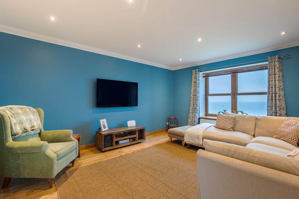 LIVING ROOM The living room for this property is located immediately on the right as you enter through the hallway. This room feels bright, calm, and thoughtfully put together. The soft blue walls create a serene and coastal atmosphere that pairs beautifully with the natural light pouring in through the window. The view outside adds an extra sense of openness and, making the space feel even more expansive with the additions of the cosy sofa and armchair.