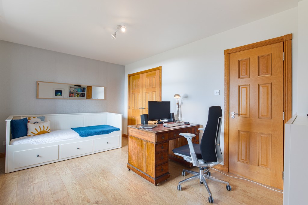 BEDROOM 2 This second bedroom is located up the stairs and down the hallway on the right-hand side as you approach the landing. The room itself was previously used as a bedroom for the young children of the house and is the ideal space for this, due to its large interior, storage cupboards, and location inside the property. The room itself also offers a great amount of light due to having two large double panel garden facing windows.