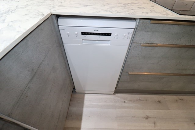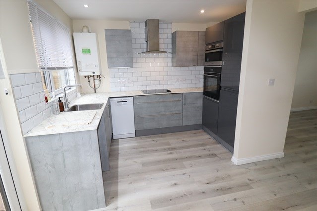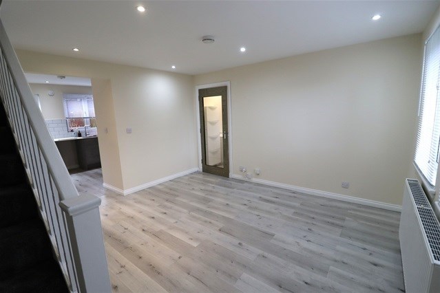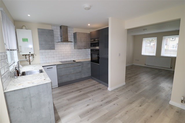 Internally there is a lounge with archway to a dining kitchen. The kitchen has an integrated oven, hob, hood and fridge/freezer.