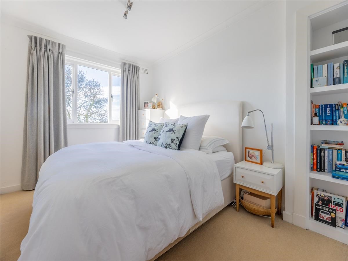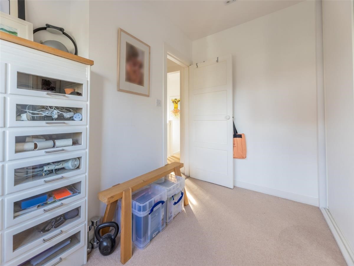 The first floor comprises two well-proportioned bedrooms, both with built-in storage, alongside a stylish family bathroom fitted with a bath, overhead shower, and contemporary tiling. The top floor hosts an impressive third bedroom- a beautifully converted attic space with excellent natural light and ample eaves storage, offering flexibility as a principal bedroom, guest room, or home office.