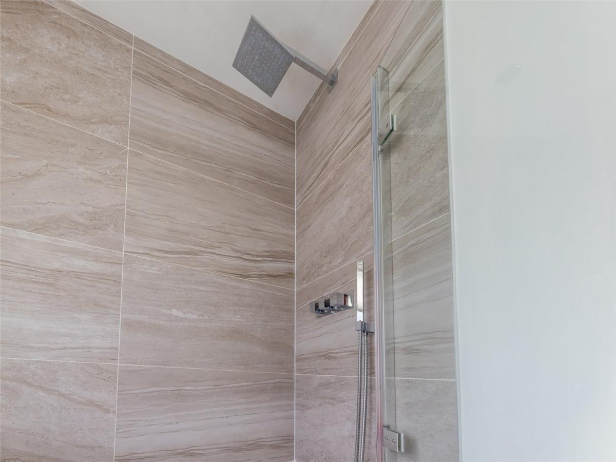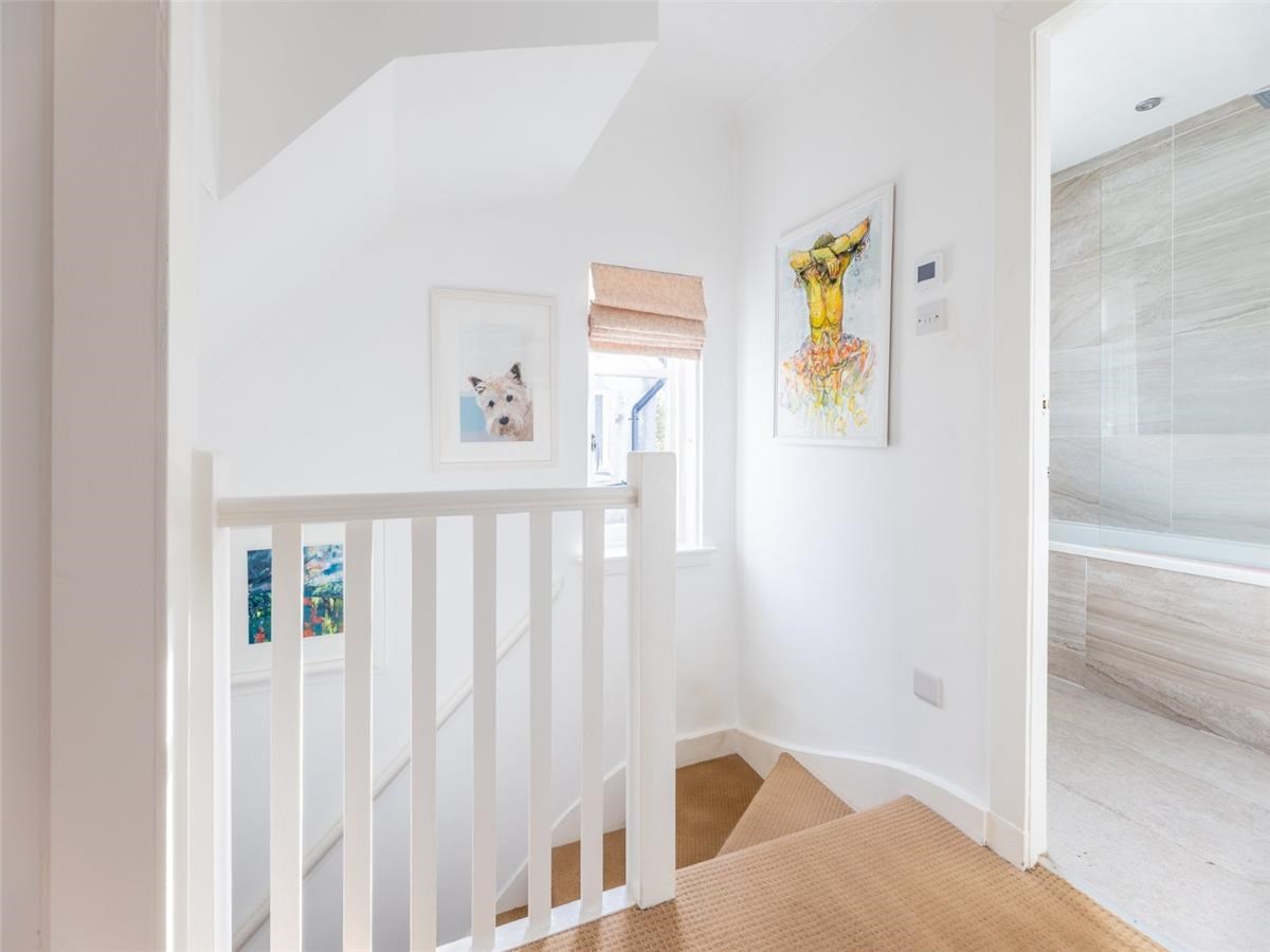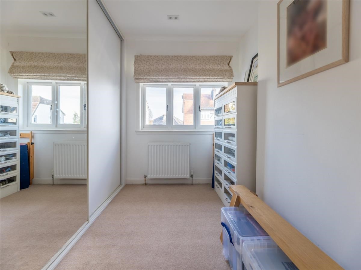 The first floor comprises two well-proportioned bedrooms, both with built-in storage, alongside a stylish family bathroom fitted with a bath, overhead shower, and contemporary tiling. The top floor hosts an impressive third bedroom- a beautifully converted attic space with excellent natural light and ample eaves storage, offering flexibility as a principal bedroom, guest room, or home office.