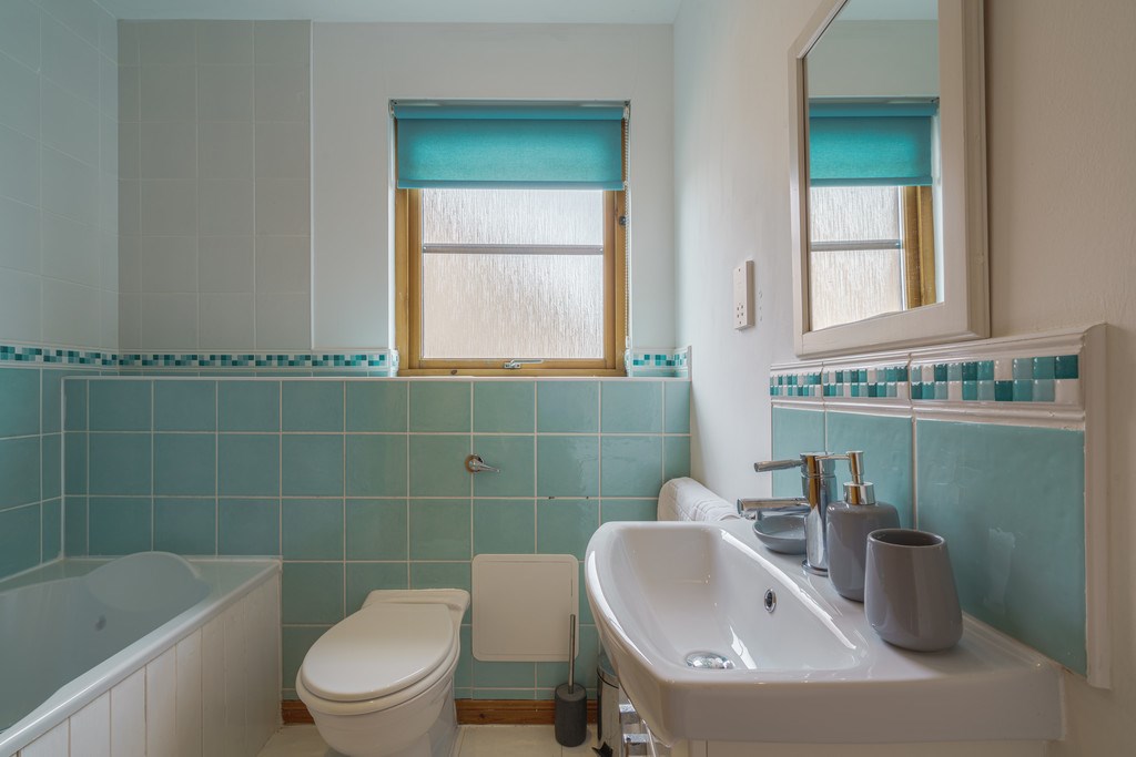 BATHROOM Good sized family bathroom with a three-piece white suite. Shower over bath and blue tiled surround.