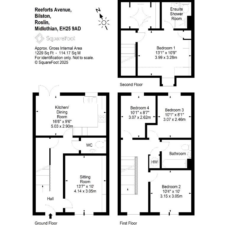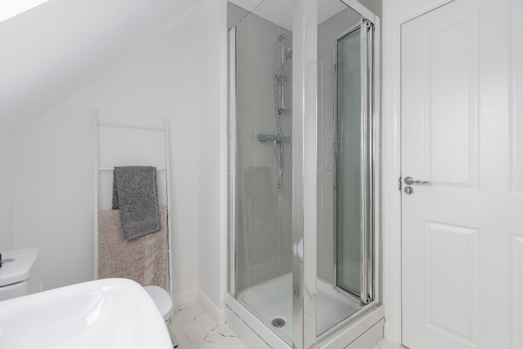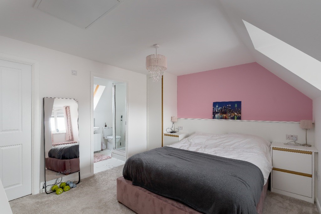 The first floor offers three well-proportioned double bedrooms, all carpeted for comfort, along with a stylish family bathroom complete with a three-piece suite and shower over the bath. The top floor hosts the impressive principal bedroom suite, featuring an en-suite shower room served by the combi boiler, built-in wardrobes with drawer space, and a walk-in wardrobe with dressing area. From this level, there are beautiful open views towards the hills.