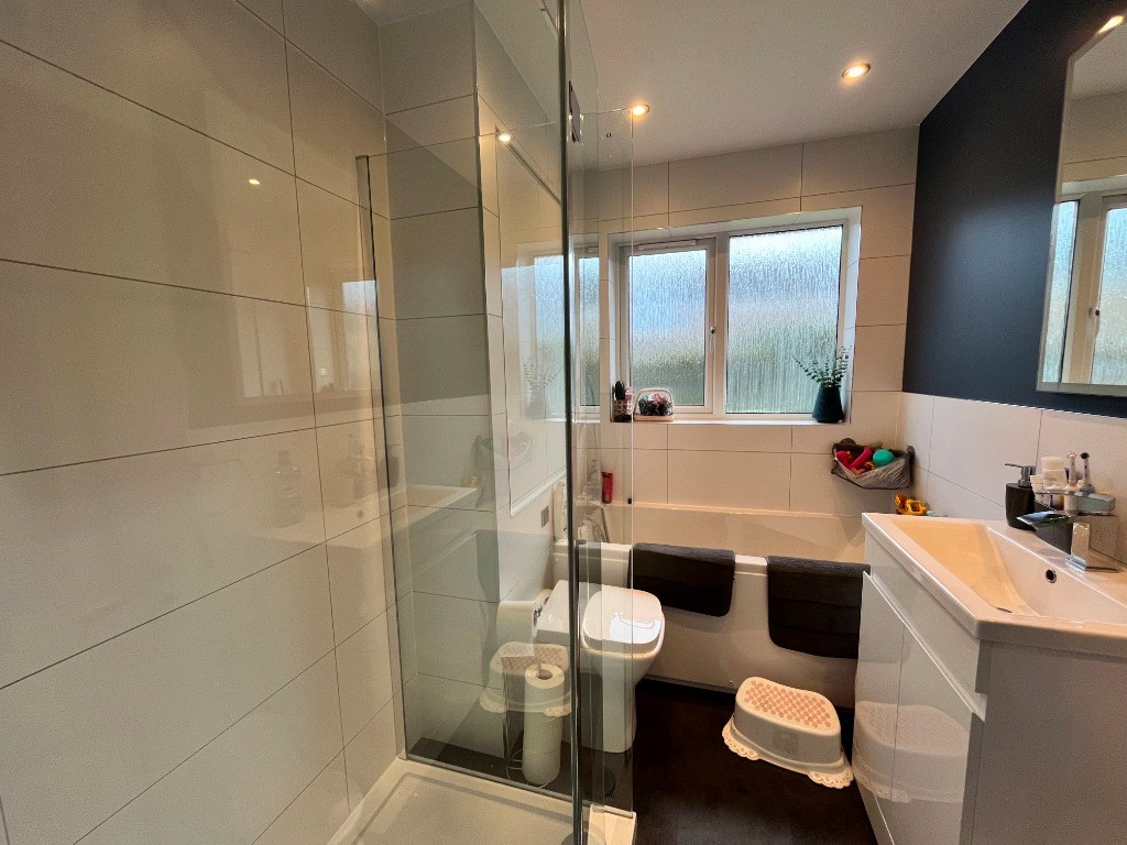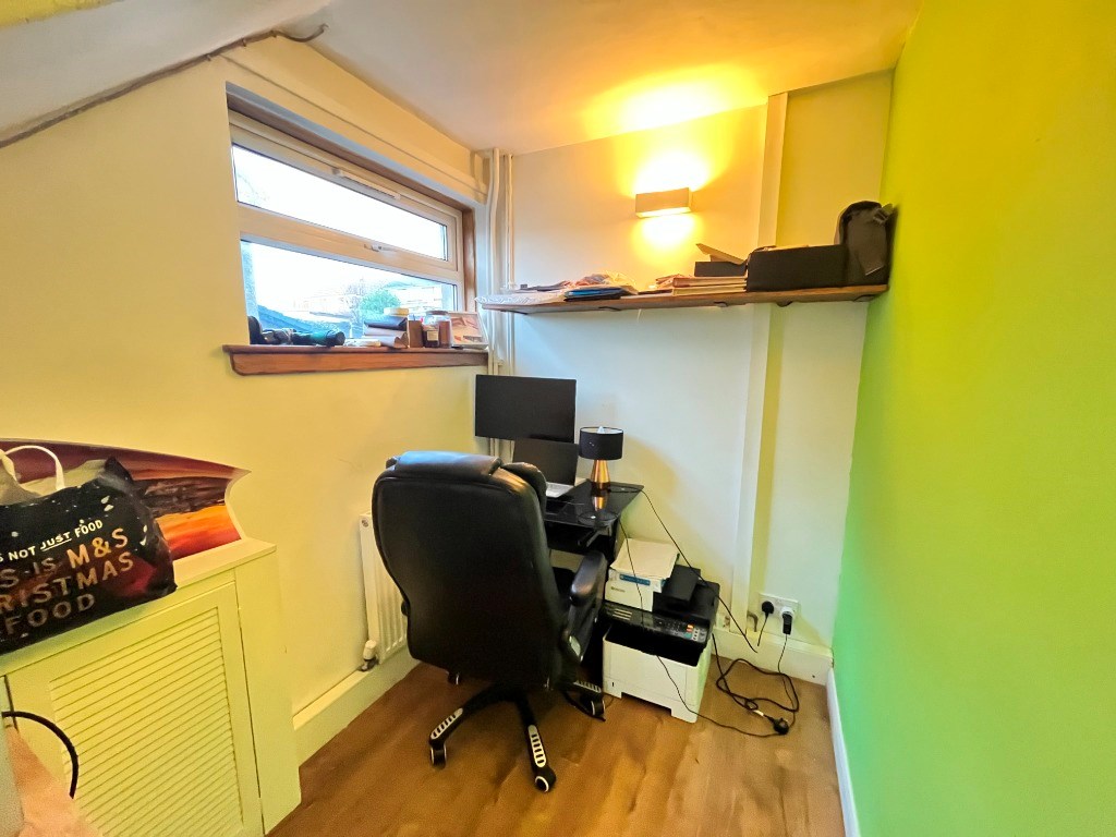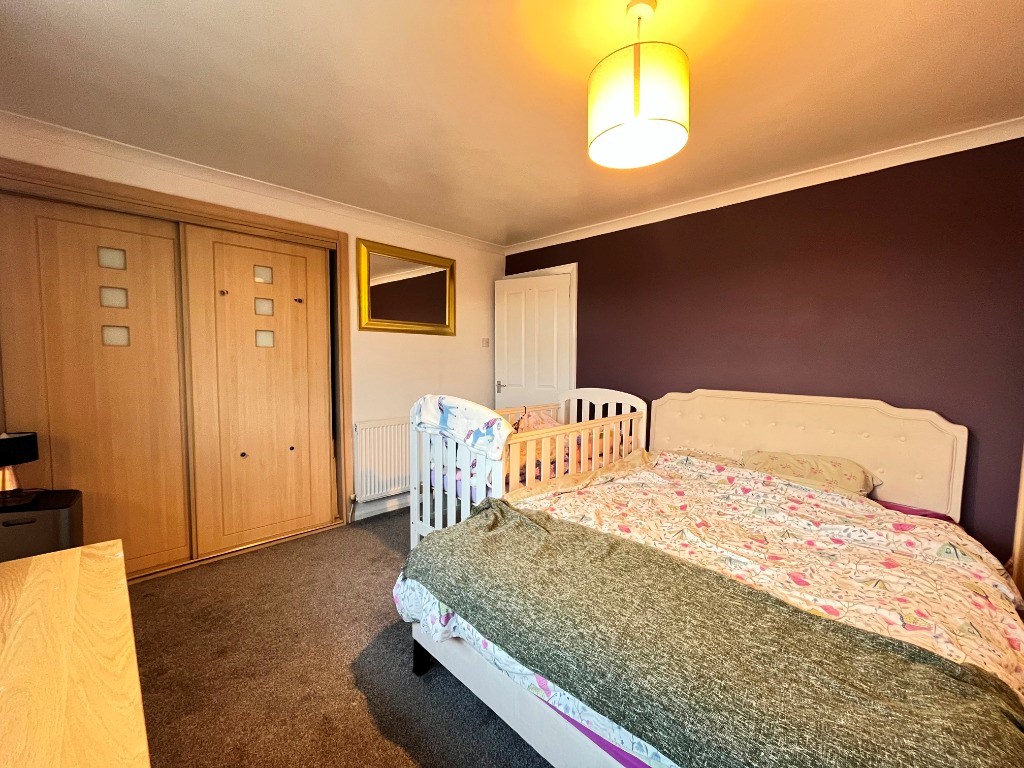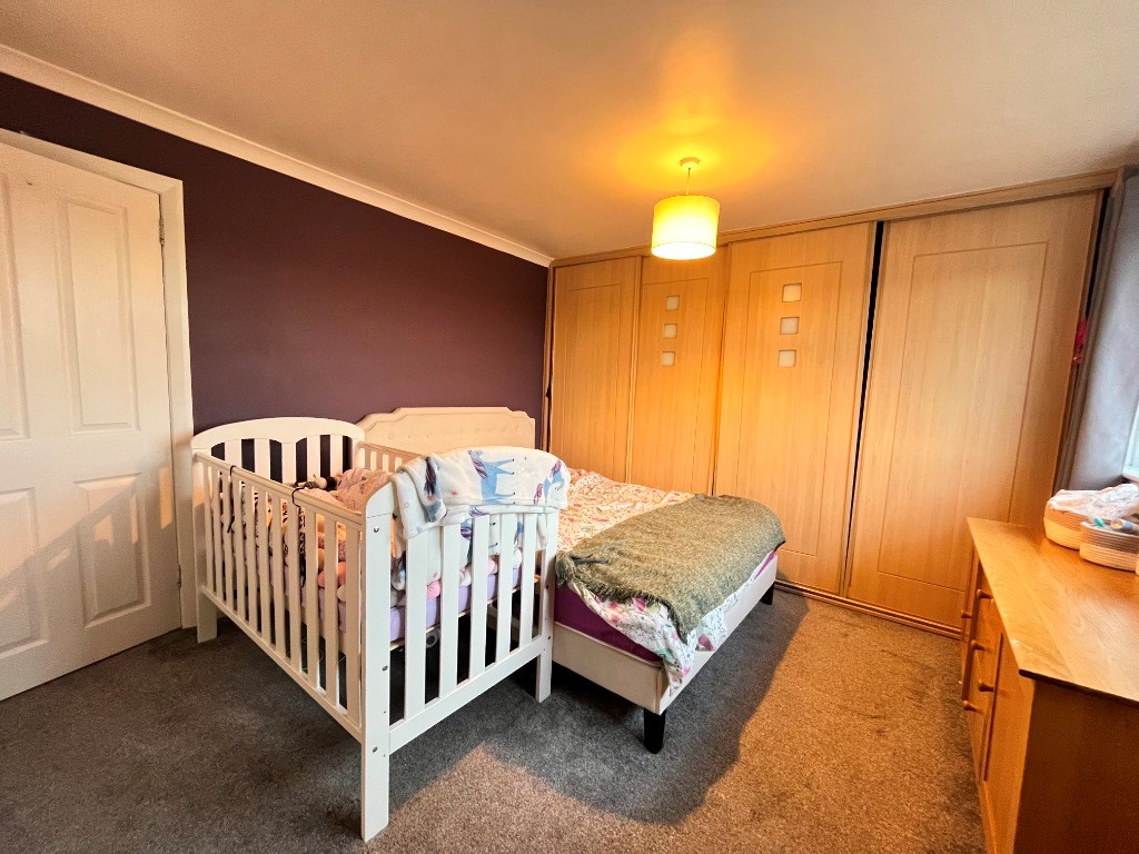 Internally the property comprises; entrance hallway with box room/home office off, spacious lounge with feature fireplace and leading to dining area with patio door to the rear gardens, modern fitted kitchen with wall and base units and white goods. Heading upstairs there are two bedrooms, both generously sized and the master benefitting from two large built-in wardrobes. Finally the contemporary tiled bathroom features four piece suite including separate shower and bath.