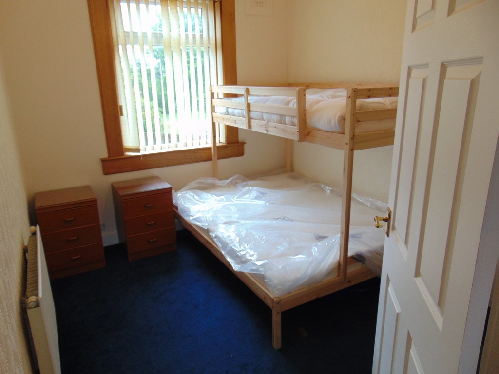 BEDROOM 2 Double bedroom furnished with a bunk bed and bedside table. Carpeted flooring. Deep storage cupboard into the eaves.