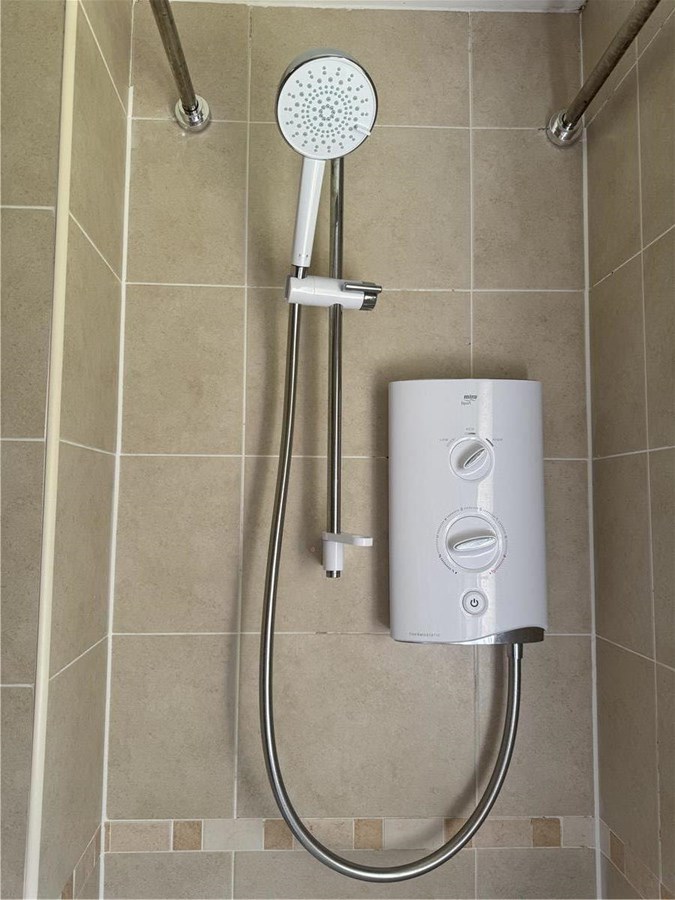 Bathroom with bath and electric power shower.