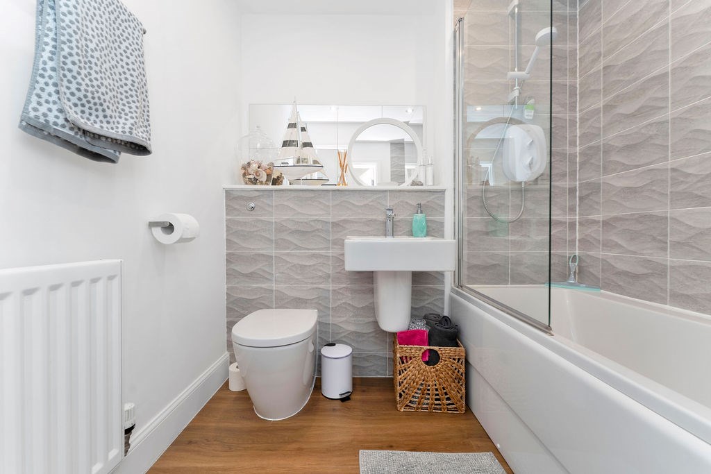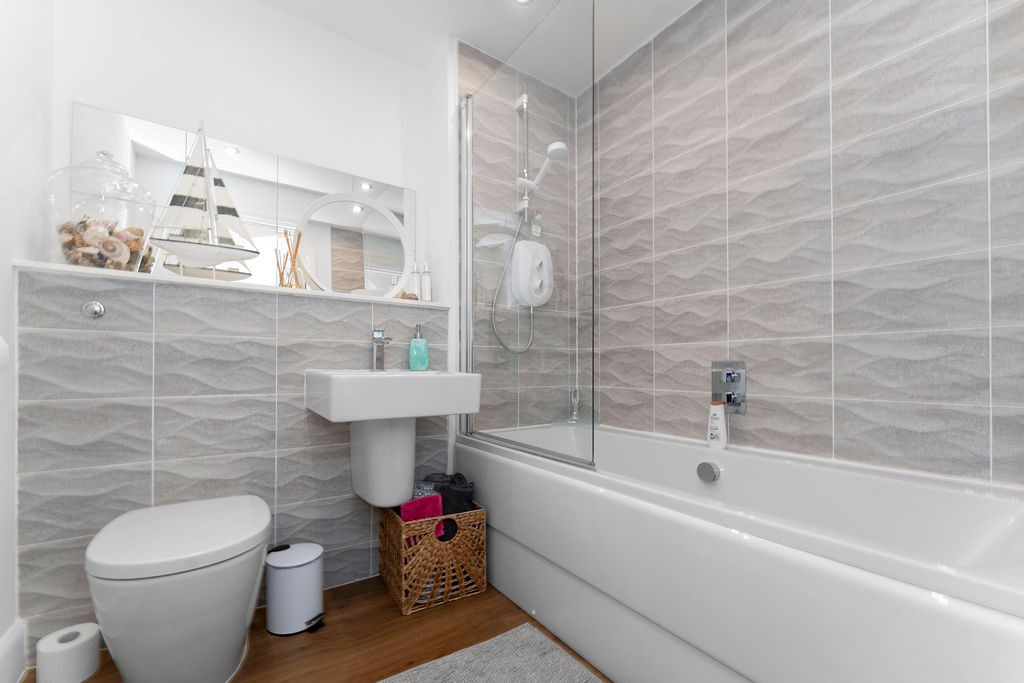 ~Attractive, tiled bathroom with three-piece suite including electric shower over bath