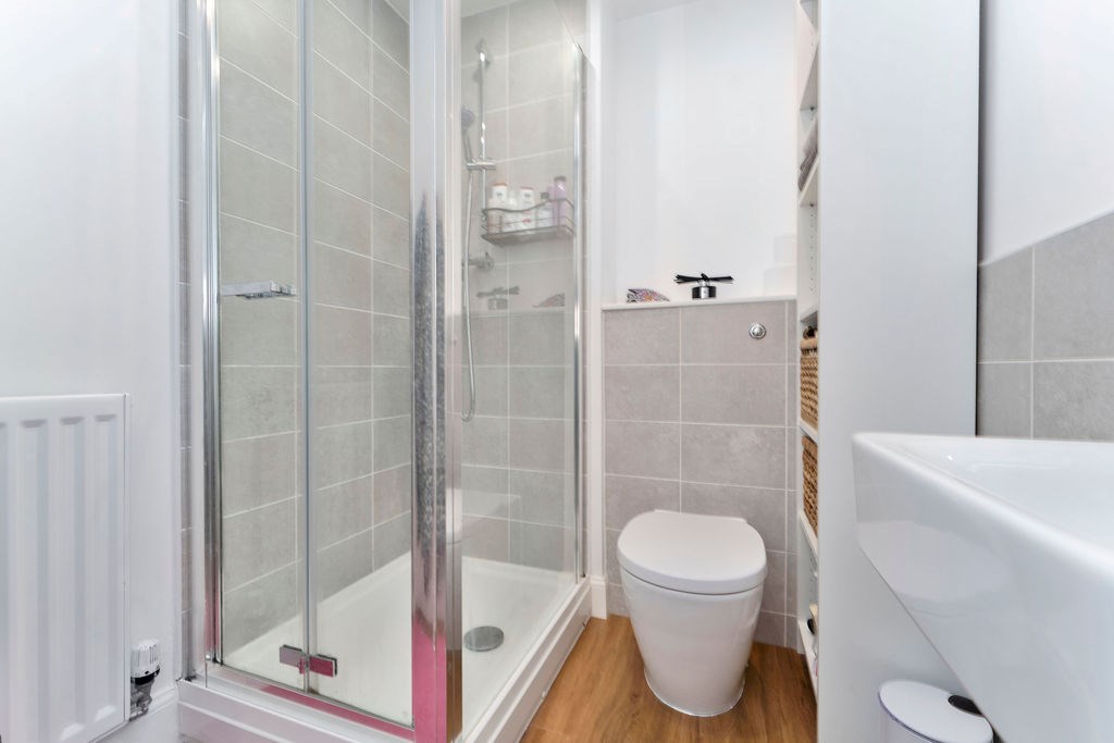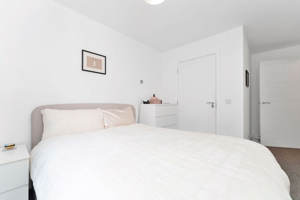 ~Master bedroom with carpeted flooring, built-in storage, private en suite shower room and access to rear garden
